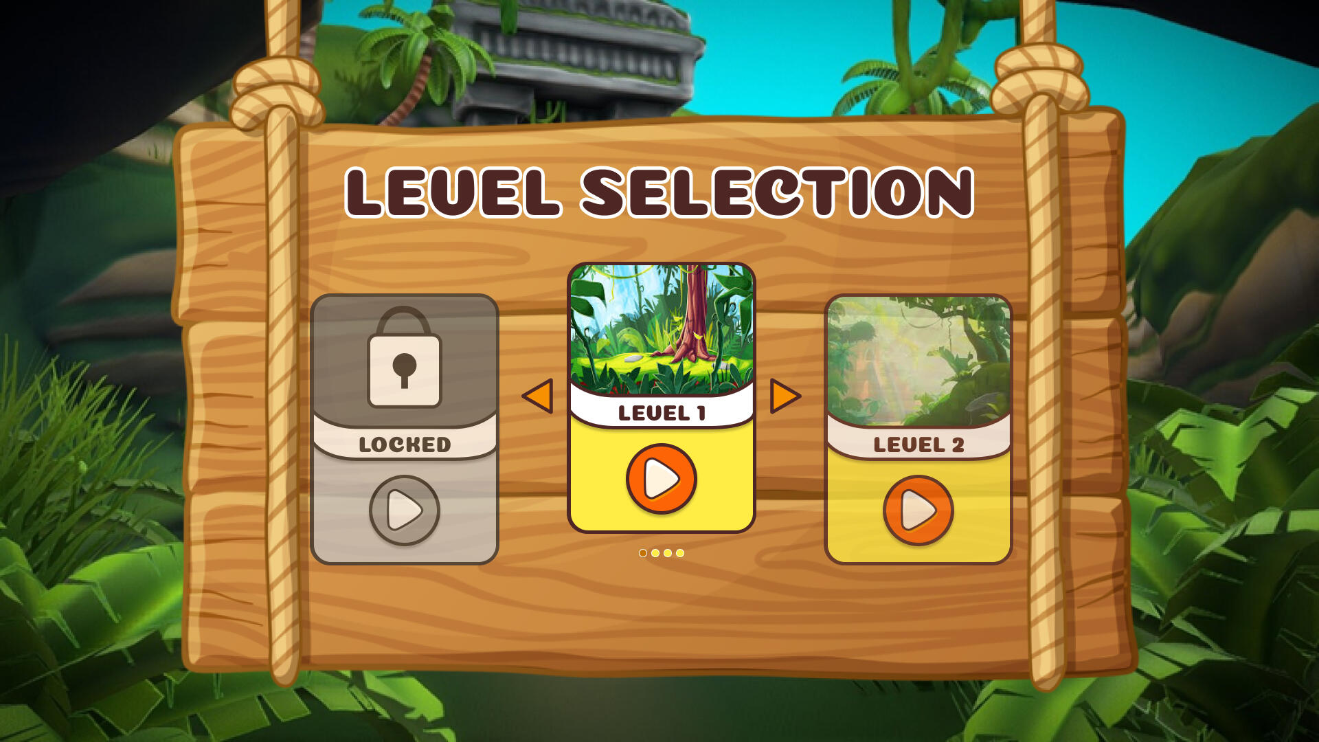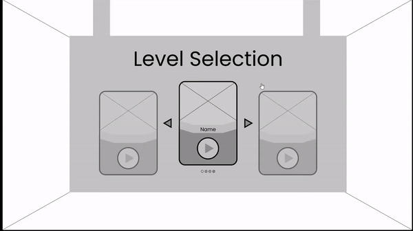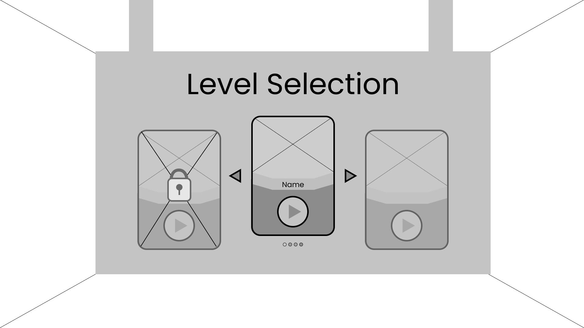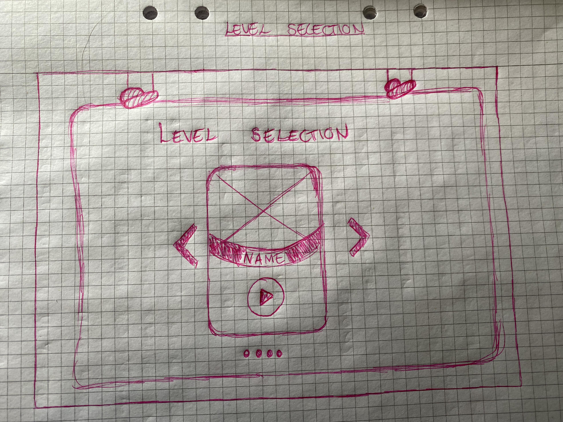 For the level selection, we had two options to choose from. We ended up going for the one closest to the bottom. Why? Since we thought with the pictures above the level it would be too much for the player to look at. We wanted to simplify it and make sure we didn't have to redesign the color scheme if it didn't fit the picture since we were under a short timeframe.