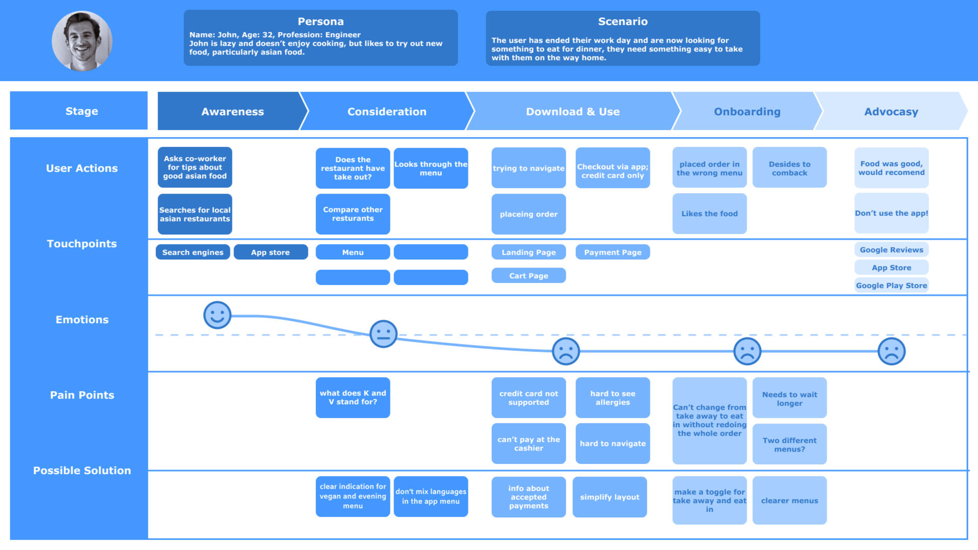 We researched the app, users' opinions, and ways to improve it. We did a user journey map to pinpoint the issues users encountered. We also wanted to embrace the street style of the restaurant in our design and give the user more of an impression of the feeling you get when you enter the restaurant