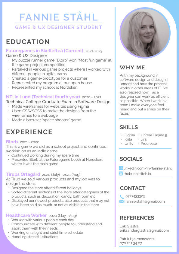 Hi, my name is Fannie and I'm 22 years old. I'm originally from Lomma in Skåne but right now I live in Skellefteå to study Game & UX Design at Futuregames. During my spare time, I like to work out, play games and express my creativity in different ways.Why did I choose the gaming industry?